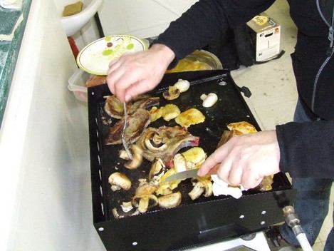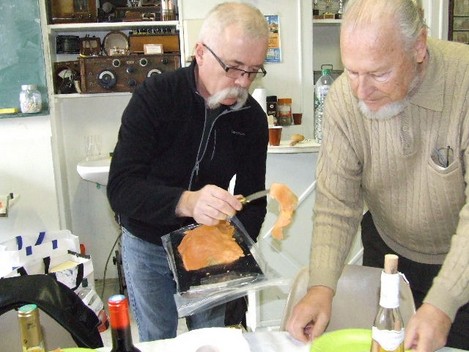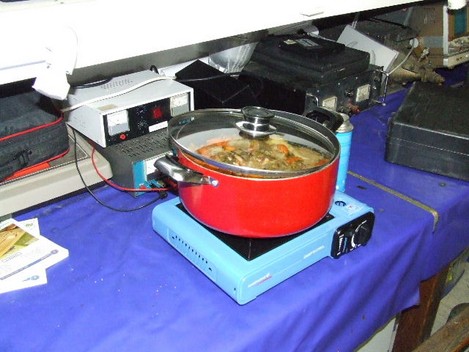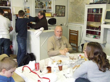 Au déjeuner Paul F4DVT, Maurice F1AQU, Alain F0GZX aux fourneaux avec Eric F0GYN, Muguette avec ses deux quatre pattes, Misho F8GGV avec YL Qrpp, F4HJJ  avec YL et Qrpp.