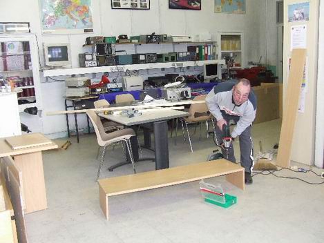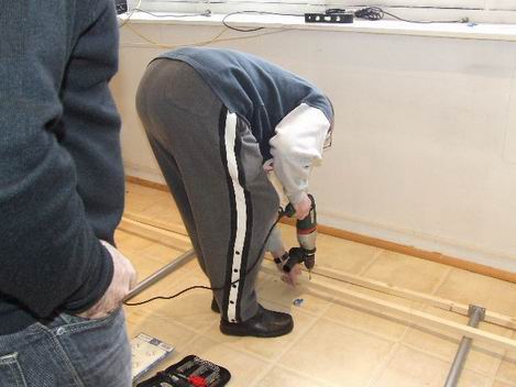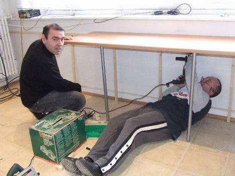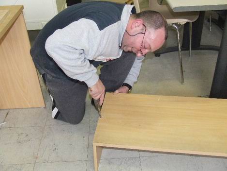 et fixation de la deuxième partie du plan de travail. Patrick aide Eric