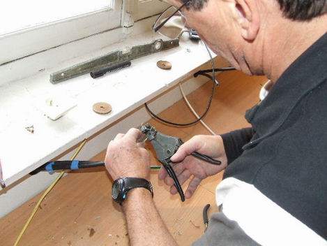 des fils électriques, je précède Eric qui visse les fils dans les prises