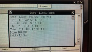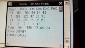 Toutes la journée, les 2 opérateurs se sont relayés au « manip ». Toutes les bandes ont pu être travaillées mais le nombre de QSO sur 15m et 10m est resté anecdotique.