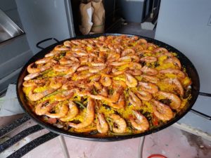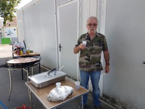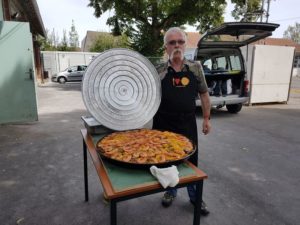 Cette année, nous avons fait de nouveau appel à Alain F0GZX pour la préparation du repas. Voici quelques années nous avions déjà eu le plaisir de voir son immense paëllera bouillonner pour nous et avons eu envie de le refaire cette année. Alain a accepté avec plaisir. Le vent a rendu la cuisson un peu capricieuse mais le ti-punch de l’YL de Patrick et quelques autres gâteries liquides et solides nous ont permis d’attendre tranquillement la fin de la cuisson. A noter qu’une partie des ingrédients de la paëlla étaient offert par Alain et nous le remercions tous.