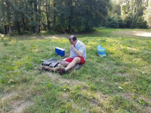 Nous avons été actifs en phonie puis en CW jusque 12h00. Johan F4HHL a commencé l’activation en phonie assis dans l’herbe au milieu du pré. Les heureux opérateurs CW disposait eux d’une table et d’un parasol. Après l’arrêt de la station CW nous avons ramené la table au milieu du champ et les opérateurs ont pu profiter d’un tout petit peu plus de confort. Vers 12H Paul F4DVT et Maurice F1AQU sont allé au ravitaillement. A leur retour nous avons déjeuné tous ensemble avec le repas offert par Maurice que je remercie encore. Après le repas nous avons relancé plusieurs appels mais visiblement le succès du matin était retombé, nous avons remballés notre installation vers 13h30.