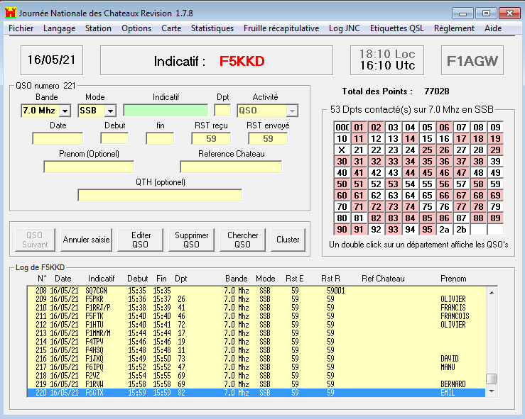 Nous terminons la journée avec 220 contacts, assez peu de châteaux ceci est probablement du à la très mauvaise météo qui a dissuadé les stations portables qui généralement activaient des châteaux.