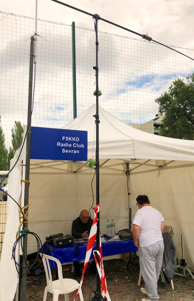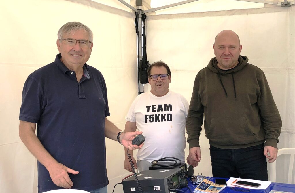 Le tout sur un espace équivalent à plus de trois terrains de football avec des tentes, alignées sur toute leur périphérie, pour abriter les nombreuses associations . La météo était un peu capricieuse et de temps en temps quelques gouttes de pluie s’invitaient. Le Radio-club F5KKD était abrité sous l’une des tentes proches de l’entrée.